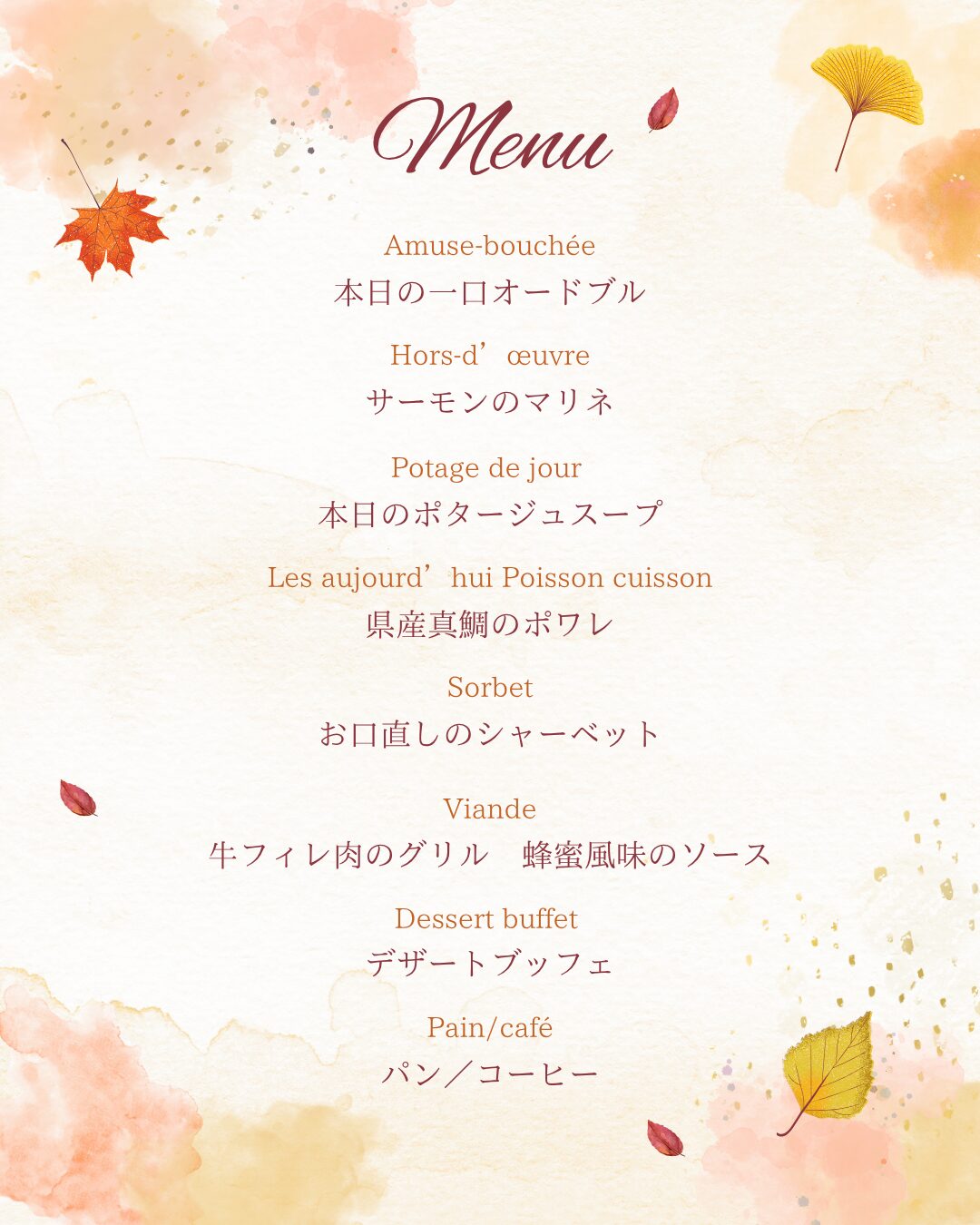 林シェフ特製の旬の食材を使用したオードブルやスープ、メイン料理のフルコースにスペシャルデザートブッフェがついた豪華コースとなっております🍽